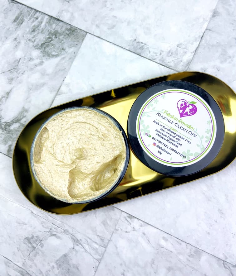 Fabskin knuckle clean off gently removes though dark stains on knuckles, toes, knees, and elbows gotten due to use of cosmetic products containing harsh chemicals like hydroquinone or mercury, or due to consistent trauma to the affected area, excessive sun exposure, constant exposure to hot water or laundry chemicals, and environmental toxins. Though the product works gradually, as it is made from purely natural ingredients, splendid results will be seen over time, with consistent usage.